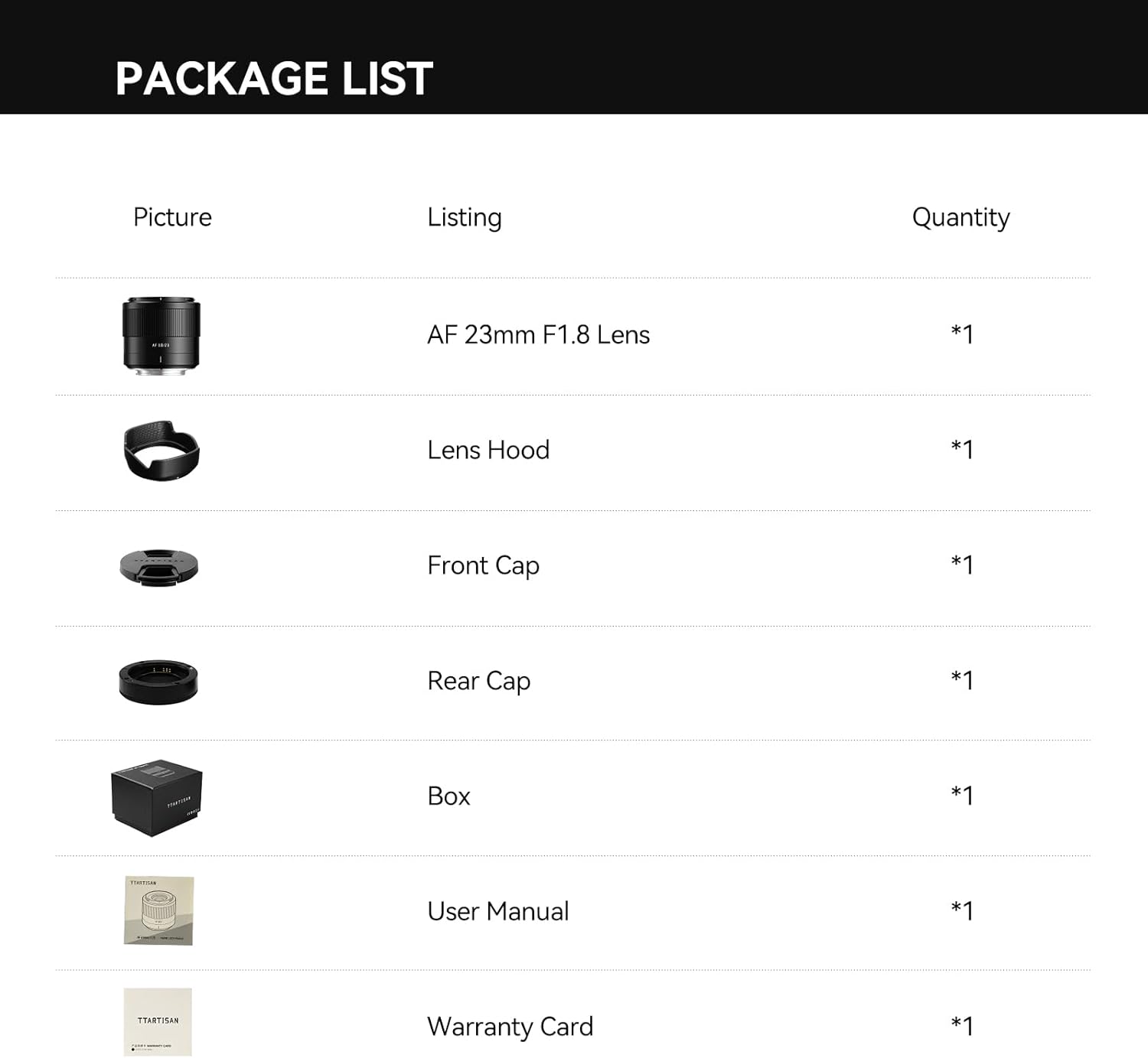 Designed specifically for Fuji X Series cameras, the TTArtisan AF 23mm lens is compatible with a wide range of models including X-A3, X-A5, X-A7, X-M1, X-M5, X-H1, X-H2S, X-T100, X-T20, X-T200, X-T3, X-T30, X-T30II, X-T4, X-T5, X-T50, X-Pro3, X-E2S, X-E3, and X-E4, as well as the X-S10.